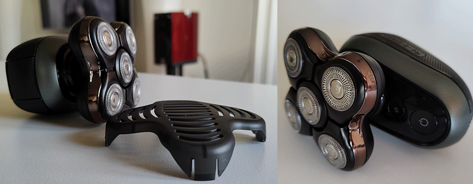 On retrouve donc un rasoir qui se tient dans la paume, doté de 5 lames rotatives flexibles et fonctionnant en mode sans fil. Il reste bien entendu étanche et utilisable sous la douche. On retrouve également la tondeuse d’appoint rétractable, positionnée à l’arrière.