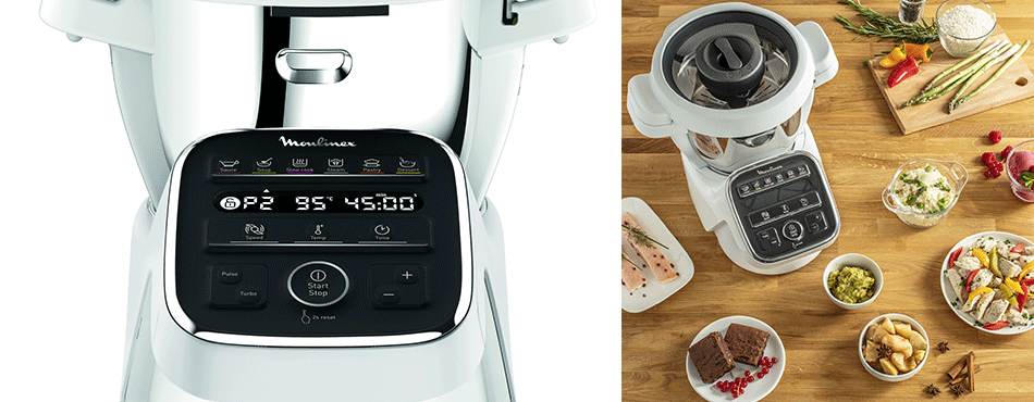 Il dispose de 7 modes de cuisson (bouillir, cuire, cuisson basse température, cuisson douce, cuisson vapeur, mijoter, réchauffer) pour couvrir un large panel de recettes, que vous choisissez et réalisez grâce au mode manuel ou à partir de celles enregistrées sur l'appareil et sur l'application MyMoulinex.