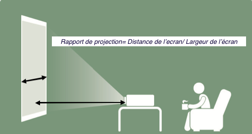 Pour choisir la position d’un vidéoprojecteur, il y a un "rapport de projection" à respecter. C’est-à-dire qu’il faut respecter une certaine distance entre le vidéoprojecteur et l’écran.