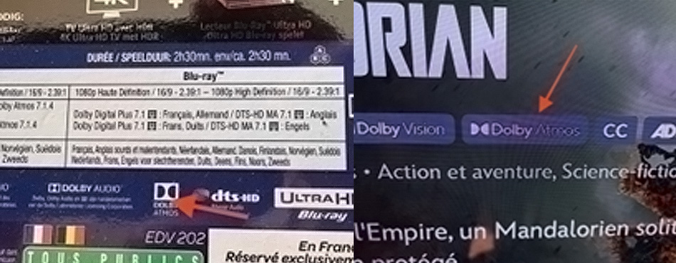 Le Dolby Atmos est indiqué comme cela sur un disque blu-ray (à gauche) et sur un programme en streaming (à droite) :