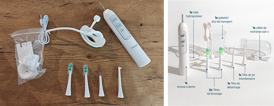 À l'ouverture, la Haepi Julia inspire confiance. Le design est épuré, la prise en main ergonomique, et la présence d'un coffret de voyage et de multiples têtes (brossage, détartrage) montre un package complet. Mais la vraie promesse n'est pas dans le design : elle est dans le concept 3-en-1 (brosse à dents électrique, hydropulseur et détartrage).