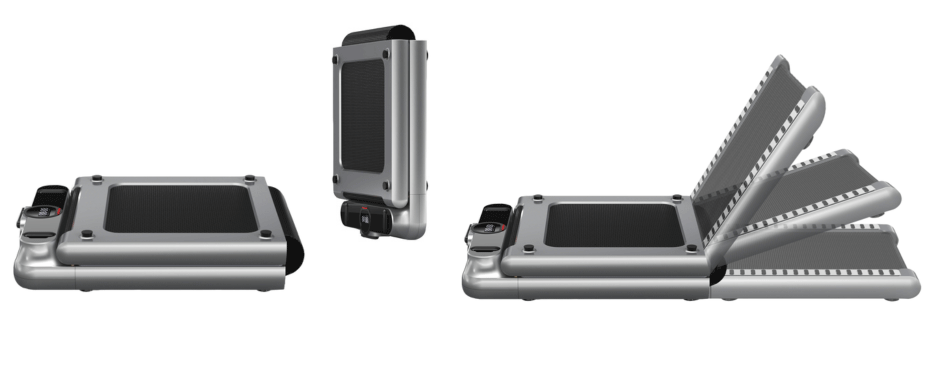 Une fois ouvert, on découvre un tapis de marche pliable, qui occupe effectivement peu de place au sol quand il est plié ; comptez 78x63 cm pour une hauteur de 16,5 cm. Vous n’aurez donc pas de souci pour le ranger dans un coin ou sous un meuble haut lorsque vous ne l’utilisez pas. Une fois déplié, sa longueur est d’un peu plus d’1m40.