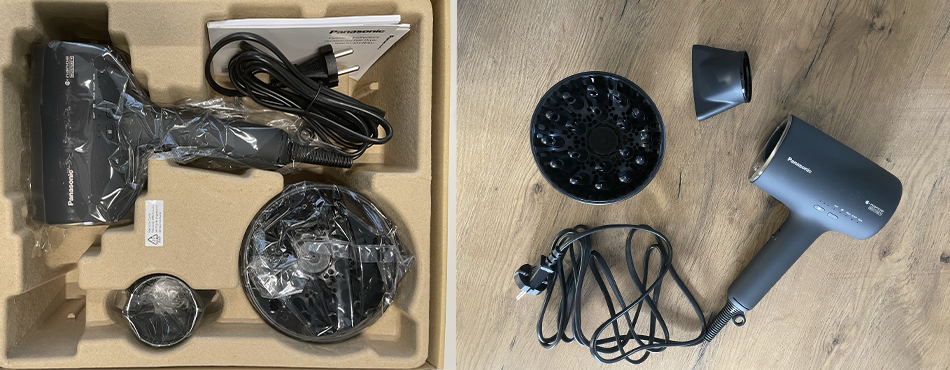 Le sèche-cheveux Panasonic EH-NA0J se présente dans un emballage très simple avec ses deux accessoires "non intégrés" à l’appareil. Je vous avoue que la présentation m’a paru un peu simpliste et que pour un appareil classé "haut de gamme", je m’attendais à un peu plus de raffinement.