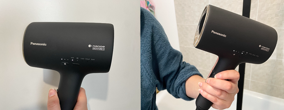 Le Panasonic EH-NA0J se classe parmi les sèche-cheveux légers voire très légers (autour de 400 grammes). On bénéficie donc d’un appareil très maniable et idéal pour les routines du matin. Les boutons de mise en fonction se situent sur le manche tandis que les autres fonctionnalités telles que la puissance de diffusion de l’air et les 4 modes disponibles se trouvent sur la tête du sèche-cheveux. On aime ou pas… Personnellement, je trouve que cela leur donne une bonne visibilité.