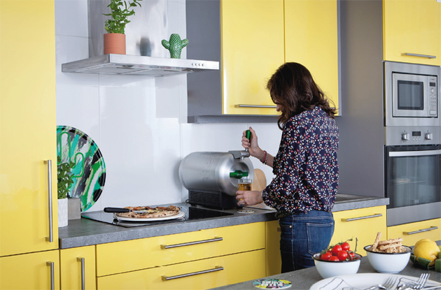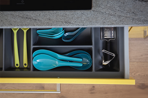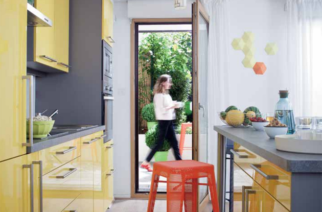 Un modèle standard (Leonardo), mais une cuisine vraiment unique grâce à une teinte réalisée sur mesure (à partir de la référence RAL 1018 jaune zinc) en laque brillante.