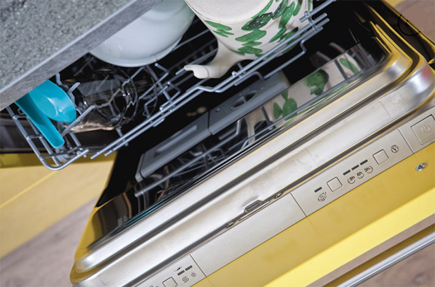 Dans une cuisine ouverte, l’électroménager doit être le plus silencieux possible, à commencer par le lave-vaisselle, qui se fait ici discret, derrière sa belle façade laquée.
