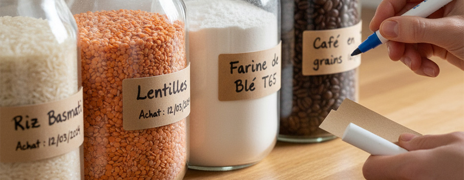 C'est le principe du "Premier Entré, Premier Sorti" (FIFO). En notant la date d'achat sur chaque bocal, vous pouvez visualiser en un clin d'œil les produits à consommer en priorité. Cela vous évite de retrouver au fond du placard un paquet de noix devenu rance alors que vous veniez d'en racheter. C'est une méthode infaillible pour assurer une bonne rotation des stocks, préserver les qualités gustatives de vos aliments et réduire considérablement le gaspillage.
