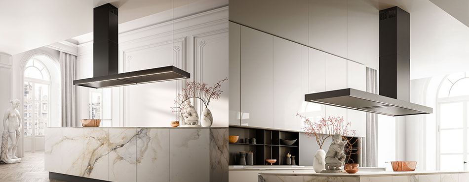 La hotte îlot Falmec ELLE redéfinit les codes de l’aspiration avec un design d’une élégance rare. Son profil en forme de "L" inversé crée une ligne continue et aérienne au-dessus de votre îlot central, transformant un appareil fonctionnel en un véritable objet d'art contemporain. Sa finition noire mate, sobre et raffinée, s’intègre parfaitement dans les cuisines ouvertes de prestige. Au-delà de son esthétique, elle brille par son éclairage LED dynamique qui parcourt toute la longueur du bandeau, permettant d’ajuster la température de lumière pour créer l'ambiance idéale.