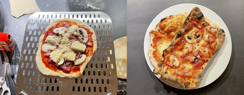 Pour la cuisson en elle-même, je ne vais pas mentir, passer la pizza non cuite de la pelle à la pierre du four demande un petit coup de main, que je n’ai pas eu du premier coup. Ma première pizza était donc plutôt une calzone (et encore) ! Il faut y aller d’un coup sec et franc pour que la pizza se décolle bien. L'astuce qui fait toute la différence, c’est de bien fariner la pâte, la pelle et la pierre, voire d’utiliser de la semoule pour encore plus d’efficacité. Mais une fois ce petit geste acquis, le plus dur est fait ! Ne reste plus qu'à regarder votre pizza cuire à travers la fenêtre, très facilement grâce à la lumière (qui s'éteint automatiquement au bout de 5 min). Et c'est impressionnant de voir les premières bulles apparaître très rapidement. Sur ce mode, il faut surveiller la pizza presque comme du lait sur le feu, car en fonction de sa taille et de l'épaisseur de la pâte, 3 min peuvent même être de trop. En tout cas, je me suis bien amusée à voir les bulles gonfler la pâte et la mozzarella fondre et gratiner doucement ! Un régal pour les yeux... et pour les papilles ?