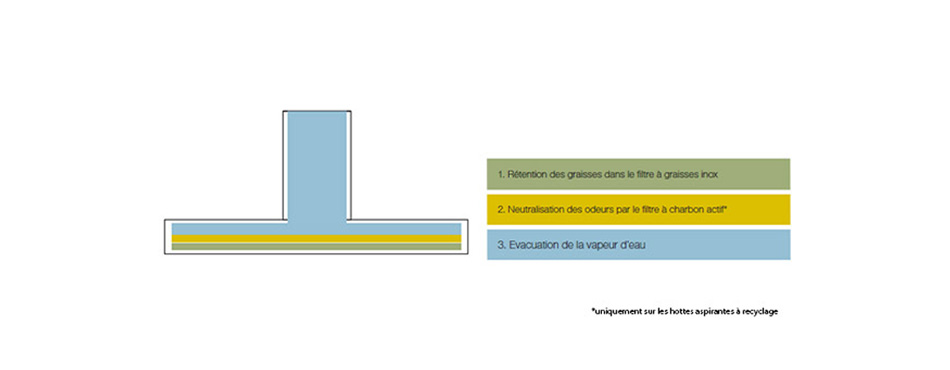 La hotte sans évacuation aspire l'air au moyen d'un moteur et le renvoie dans la pièce après l'avoir purifié à travers différents filtres. D'abord celui à graisse, puis par un filtre spécial à charbon actif. Ce filtre est uniquement présent en mode recyclage. Il désodorise l'air avant de le renvoyer dans la pièce. La hotte à recyclage fonctionne en circuit fermé. Elle ne nécessite pas de conduits, ni d'ouvertures dans les murs. Ainsi, son montage est simplifié.