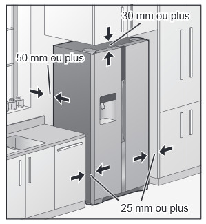Pour garantir une bonne circulation de l'air autour du réfrigérateur, veillez à aménager suffisamment d'espace des deux côtés comme au-dessus de l appareil, et conserver un intervalle de 5 cm entre l'arrière de l'unité et le mur.