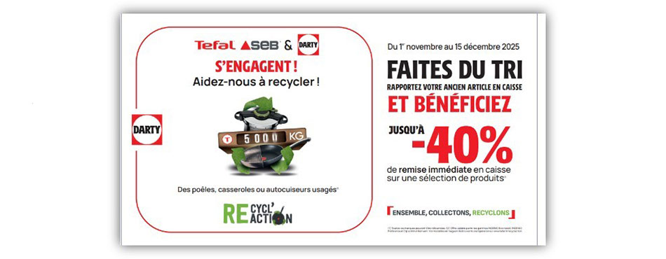 Depuis 2012, Tefal a déjà collecté plus de 2 millions de produits et a lancé début 2025 la première filière mondiale de collecte et de recyclage des poêles usagées ! Pour cette première opération conjointe, Tefal et Darty ambitionnent de collecter au minimum 5 000 kg de produits usagés pour les recycler en de nouveaux articles de cuisine, preuve d’un engagement commun pour plus de circularité !
