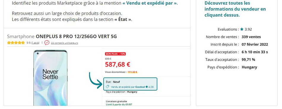Vous avez déjà commandé sur Darty.com ? Oui ? Eh bien, commander sur la Marketplace est assez similaire. Vous pouvez reconnaître les produits commercialisés en Marketplace grâce à la mention "Vendu et expédié par". Vous pouvez accéder à la fiche vendeur qui contient toutes les informations nécessaires le concernant. Vous voyez également quel est l'état du produit que vous allez acheter : parfait état , très bon état (le produit a déjà servi mais il ne présente aucun défaut), bon état (il fonctionne parfaitement mais peut présenter des traces d'usage), état correct (les signes d'usure sont manifestes même si le produit fonctionne).