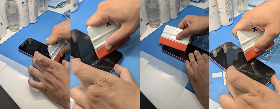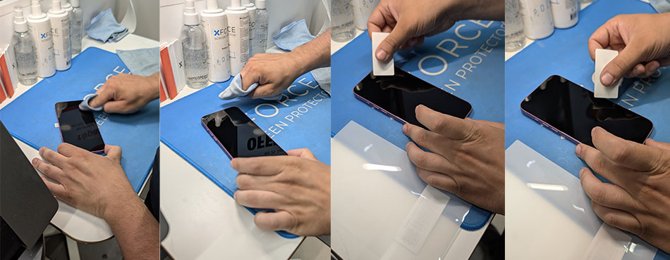 C'est là que la précision de notre spécialiste entre en jeu. Il positionne le film et ensuite utilise une technique d'application progressive, du centre vers les bords, pour chasser l'air et éviter la formation de bulles. Cela permet d'ajuster parfaitement le film sur l’écran de votre smartphone.