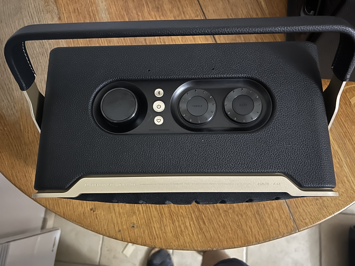Le dessus de l'enceinte est réservé aux fonctions d’utilisations. 3 molettes pour les aigus (treble), les graves (Bass) et le volume. Mais cette troisième touche permet aussi de mettre en pause, avancer et reculer parmi les pistes, en fonction du nombre de "taps" : 1, 2 ou 3. Il y a aussi 2 micros pour utiliser les différents assistants vocaux disponibles (Alexa et Google Assistant).