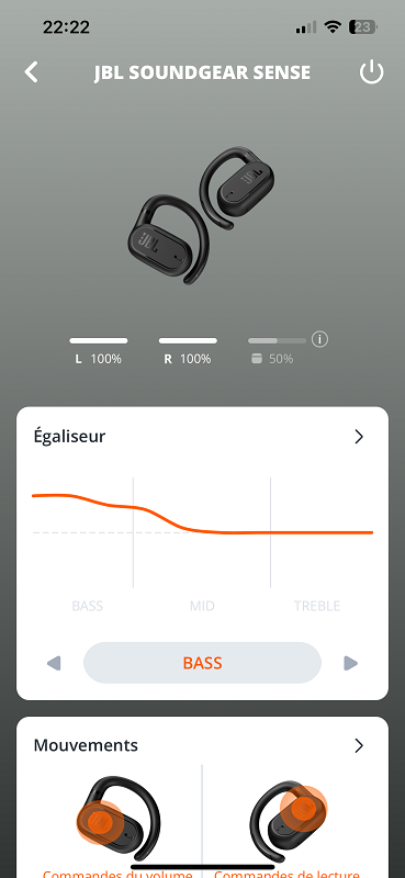 Les mélomanes ne seront pas en reste car ce casque a une très bonne restitution sonore. Vous pouvez la paramétrer à votre guise via l’application JBL Headphone. L’application vous permettra de régler le son via des préréglages (5 profils d’égaliseurs) ou, si vous préférez, vous pourrez régler plus finement les différentes fréquences comme vous le voulez via l’équaliseur intégré.