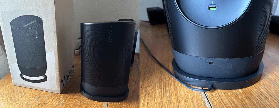 La Sonos Move 2 reprend la même esthétique que sa devancière, la Sonos Move. L’emballage est classique pour Sonos, l’appareil est fourni avec un socle de charge et l’alimentation secteur.