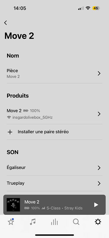 Pour une qualité optimale du son en fonction de la pièce, la Sonos Move 2 propose la calibration acoustique Trueplay, soit en automatique via ses micros, soit plus complète avec un smartphone Apple (iPhone).