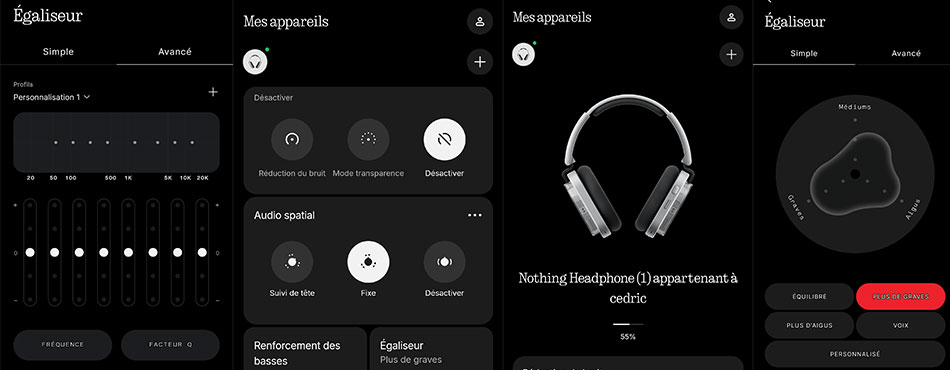 Bien sûr, tout casque haut de gamme qui se respecte se doit d’embarquer la fonction de réduction de bruit active (ANC). Le Headphone (1) l’intègre bien évidemment, et sa qualité est excellente !
