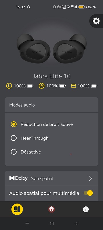 Une fois vos écouteurs connectés en Bluetooth, vous accédez aux informations et réglages de base : niveau de charge de chaque écouteur et du boîtier, sélection du type de réduction de bruit, réglage de l’égaliseur à 5 bandes, activation de l’Audio Spatial (nous y reviendrons), etc.
