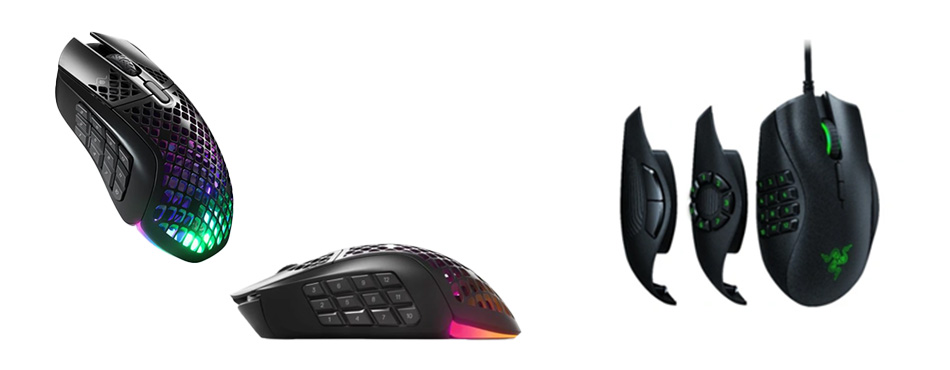 Dernière catégorie : les souris avec 12 boutons programmables ou plus. Elles sont destinées aux utilisateurs de jeux MMO/MOBA (Massively Multiplayer Online Game/ Multiplayer online Battle Arena). Généralement, une grille de 12 boutons est située en façade. La programmation de chaque bouton se fait en fonction de chaque jeux et permet, avec le pouce, de lancer un sort ou d’activer une compétence en particulier. Ce type de souris n'est clairement pas destiné aux débutants et à tous les joueurs, mais elle fait la différence pour les joueurs passionnés.
