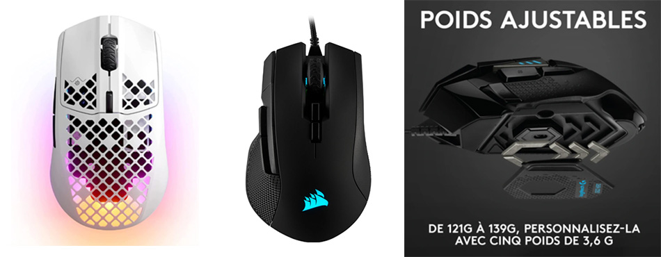 > La souris ultralégère Steelseries AEROX 3 WIRELESS SNOW, la souris de poids moyen Corsair IRONCLAW RGB et la souris de poids lourd Logitech G502 HERO