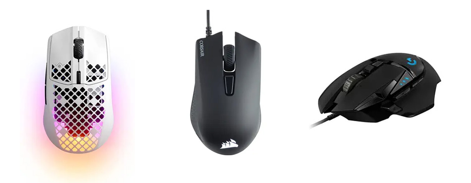 > La souris ultralégère Steelseries AEROX 3 WIRELESS SNOW, la souris de poids moyen Corsair HARPOON RGB PRO Black et la souris de poids lourd Logitech G502 HERO