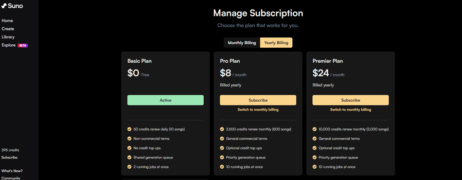 Créer une musique, ou plutôt demander à Suno de générer un son coûte 10 crédits. Vous recevez chaque jour 50 crédits. Et la limite maximale de crédits sur un compte gratuit est de... 50. Ils ne peuvent donc pas être cumulés. Un système quelque peu bloquant qui incite les personnes ne payant pas d'abonnement à revenir chaque jour pour recevoir les 50 crédits et/ou à tous les utiliser pour "vider" son compte et le recharger le lendemain. Car Suno est disponible en version gratuite ou payante, via un abonnement, dont nous parlerons plus en détail.