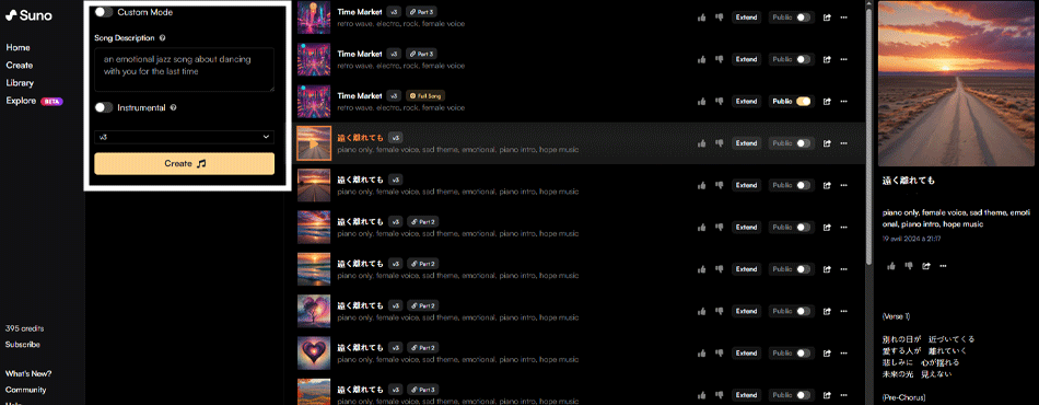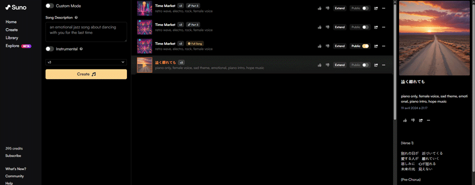 Si vous voulez créer une chanson entière d'environ 8 minutes ou plus, c'est faisable ! Vous allez diviser vos paroles en plusieurs parties. Il vous suffit donc de diviser vos couplets en plusieurs parties. Insérez la première partie dans la fenêtre de chat, renseignez le reste des informations de votre son, puis créez ladite musique. Une fois que vous avez choisi la proposition qui vous plaît le plus, cliquez sur le bouton "extend" visible avec toutes les options de votre musique. Vous allez donc effacer les paroles pour mettre les suivantes. Vous pouvez également choisir à partir de quand, dans la première partie, Suno doit commencer la deuxième. Cliquez ensuite sur "create", et Suno va créer la nouvelle partie ! Vous pouvez continuer ainsi pour une troisième, voire une quatrième partie. Une fois toutes vos parties créées, allez dans les options de la dernière partie, via les trois points tout à droite de la fenêtre, et cliquez sur "Get Whole Song". Suno va compiler toutes les parties et créer une seule musique.