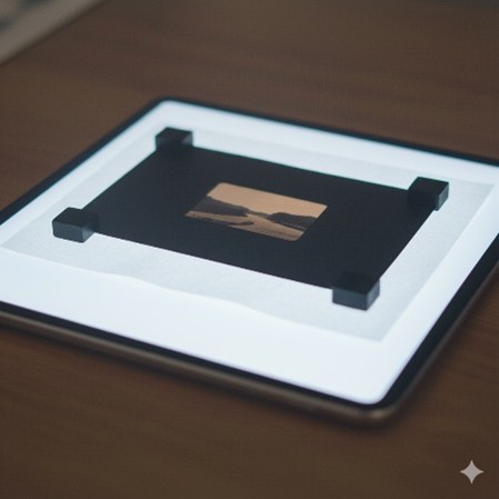 Attention, ne posez pas la diapositive directement sur l'écran de la tablette ! Autrement, vous verrez les pixels de l'écran (effet de moiré). Surélevez donc la diapo de quelques centimètres. Vous pouvez aussi confectionner un support en carton avec en son centre un orifice légèrement plus petit que la diapositive pour pouvoir effectuer la prise de vue de façon stable. Aidez-vous de la représentation ci-dessous :