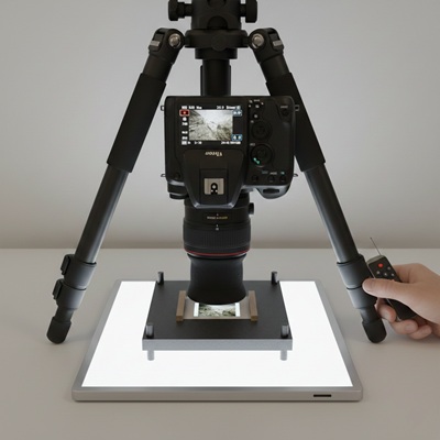 Autre possibilité le banc de reproduction classique : l'appareil est alors monté sur une colonne verticale, pointant vers une table lumineuse. Cette méthode est plus polyvalente (permettant de scanner des formats variés comme le 120 ou le 4x5 pouces), mais nécessite un alignement rigoureux à l'aide d'un niveau à bulle ou d'un miroir. Une fois que tout est réglé, c'est ultra-rapide (quelques secondes par photo).
