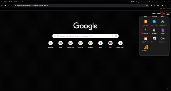 Commençons par faire un état des lieux. Dans le navigateur Chrome, cliquez sur le menu des applications Google (1), puis cherchez l’application Google One (2).