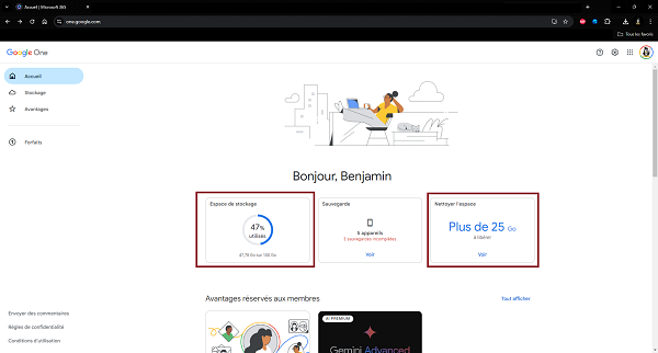L’application vous indique votre taux d’occupation de votre stockage et la quantité d’espace libérable. Dans mon cas, 47% de mon stockage de 100Go est occupé et je dois pouvoir libérer 25 Go de place (encadrés rouge).