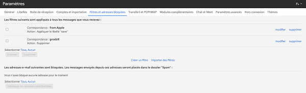 Les filtres, vos alliés : Créez des filtres pour trier automatiquement vos mails en fonction de critères précis (expéditeur, sujet, etc.), vous pouvez même créer un filtre qui va les envoyer directement à la corbeille en fonction des mots clé choisis.
