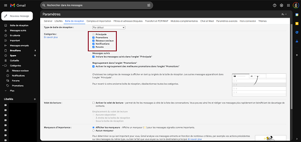 Sélectionnez "Promotion", "Réseaux Sociaux", "Notifications"et "Forums" et validez les modifications.