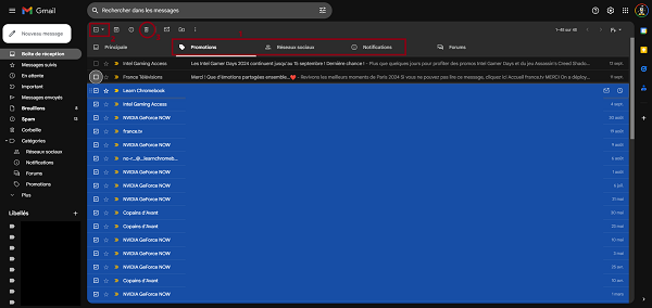 Retournez sur la boite de réception, choisissez un des onglets (1) , sélectionnez tous les mails (2) - ou seulement certains - à mettre à la poubelle et validez en cliquant sur l’icône poubelle (3).