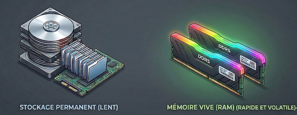 La RAM (Random Access Memory) est la mémoire à court terme de votre ordinateur. Contrairement au disque dur ou au disque SSD qui sont des zones de stockage permanent, la mémoire vive est une mémoire "volatile" qui s'efface dès que le PC est éteint. Elle permet au processeur d'accéder instantanément aux fichiers système et aux logiciels en cours d'exécution sans avoir à les chercher sur le stockage lent.