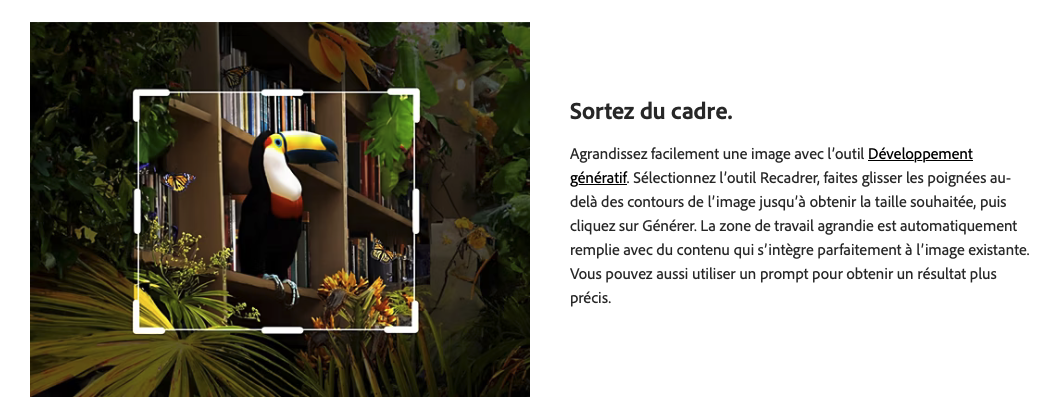 Le gros avantage de l’IA, c’est son gain de temps. Tous les grands logiciels de retouche photo comme Photoshop intègrent aujourd'hui de l’IA. Cela permet de corriger des erreurs, de retoucher les photos avec beaucoup plus de facilité et de gagner un temps non négligeable. Voire de compléter la photo avec l’IA générative, comme ci-dessous :