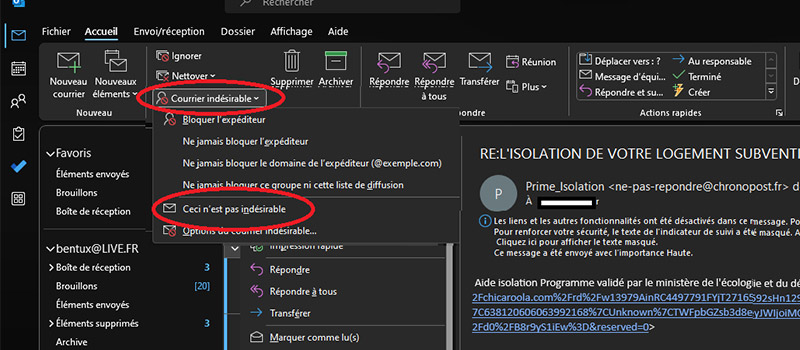 Si vous signalez le courriel en tant que spam, tous les courriels suivant provenant de la même adresse seront automatiquement reconnus et dirigés vers le dossier "Spam". Pour annuler l'opération, il suffit d’accéder au dossier, de sélectionner le courriel désiré et de cliquer sur "Pas du spam".