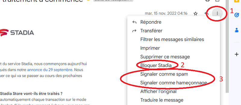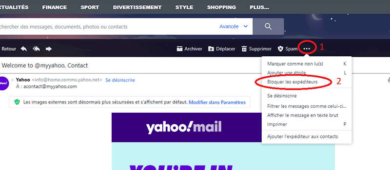 Si vous voulez bloquer une adresse, la procédure est la suivante : cliquez sur les trois petit point (1) , une boite de dialogue s’ouvre, sélectionnez "Bloquer les expéditeurs" (2) et confirmez votre choix.