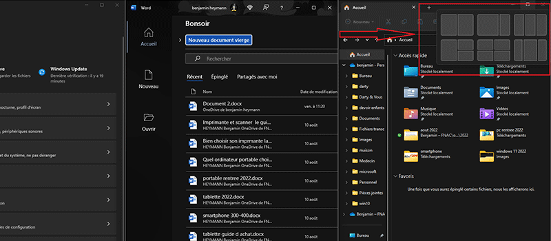 L’organisation des fenêtres devient plus intuitive avec de nouveaux raccourcis tactiles pour les PC hybrides Microsoft, mais aussi via la souris pour les PC classiques. Cette mise à jour vous propose plus de possibilités pour organiser la disposition des fenêtres (6 contre 4 avant) et l’apparition d’une zone de placement en haut au milieu de l’écran.