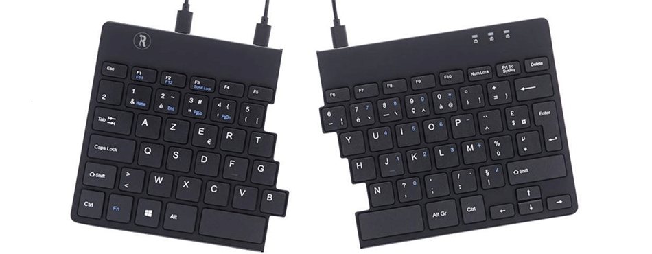 On trouve sur le marché essentiellement des claviers ergonomiques monoblocs, bombés vers l’intérieur pour positionner correctement la main. Mais il existe également des claviers ergonomiques qu’il est possible de séparer en deux parties, l’une pour la main droite et l’autre pour la main gauche. Cela permet d’adapter parfaitement leur position respective en fonction de ses goûts. C’est le cas du modèle R-GO Tools Split.