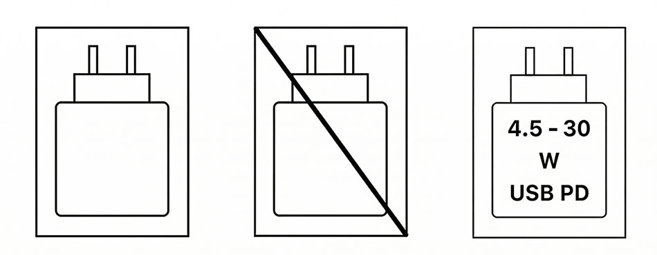 Un logo représentant un chargeur indique que l'adaptateur secteur est inclus. Le même logo avec une barre oblique indique son absence, favorisant le réemploi d'anciens chargeurs.