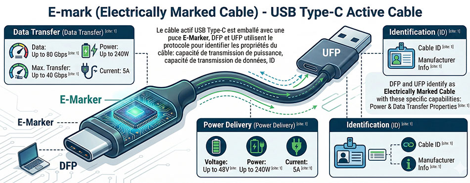 Pour la norme EPR (240W), l'E-Marker doit gérer jusqu'à 48 volts, et le câble doit disposer de protections mécaniques renforcées pour prévenir les arcs électriques lors du débranchement. Il est fortement déconseillé d'utiliser des câbles à petit prix sans E-Marker, car ils risquent d'endommager irrémédiablement le port USB-C de votre ordinateur.
