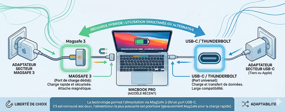 Sur les MacBook Pro 16 pouces équipés de puces M1 et M2, le MagSafe était obligatoire pour atteindre 140W, car les ports Thunderbolt 4 étaient limités à 100W (PD 3.0). Sur les modèles récents (puces M4,M5), les ports USB-C supportent le PD 3.1 EPR, permettant la charge à 140W via MagSafe ou un câble USB-C de 240W.