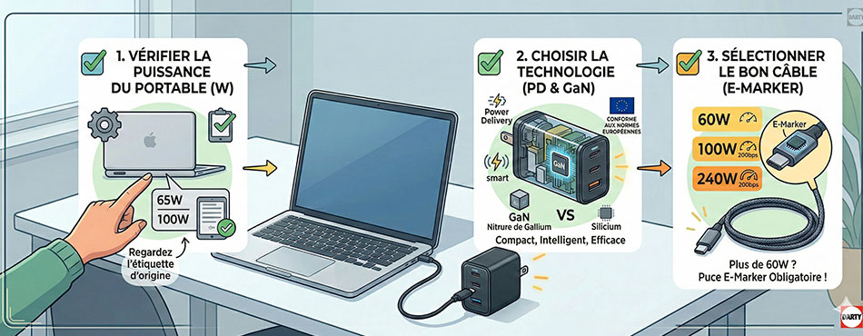 Le câble est un composant intelligent de l'écosystème de charge. Un chargeur puissant ne sert à rien si le câble qui le relie à l'ordinateur n'est pas adapté.