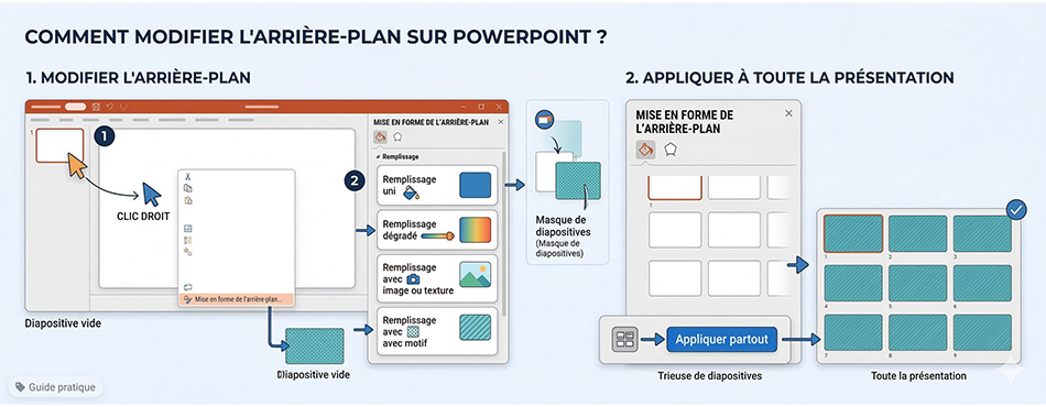 Si vous avez trouvé le style parfait et que vous voulez qu'il s'applique à l'ensemble du diaporama, cliquez sur le bouton Appliquer partout situé tout en bas du volet une fois vos réglages faits dans le volet "Mise en forme de l'arrière-plan".