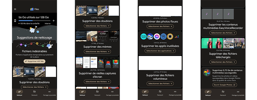 Une fois l’application ouverte, elle vous propose de nettoyer les fichiers indésirables (le cache) et ensuite elle vous laisse choisir si vous voulez supprimer les doublons, les mèmes (images avec du texte dans les chats de groupe), les vieilles captures d’écran, les photos floues, les applications inutilisées, les fichiers volumineux (les vidéos en règle générale), les fichiers audio enregistrés avec le smartphone, et pour finir les fichiers multimédias qui sont sauvegardés dans Google Photos.