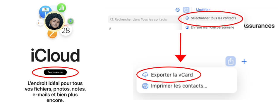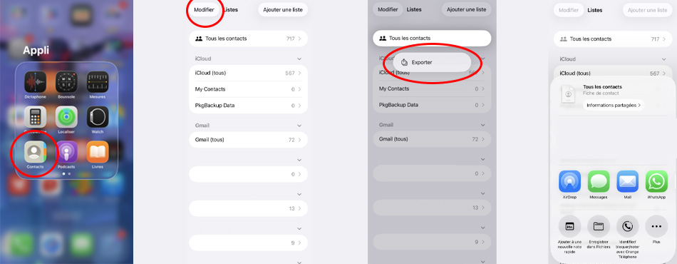 Il existe une solution simple à utiliser directement depuis l’iPhone. Pour ce faire, ouvrez l’application Contacts et dans l'onglet Modifier, appuyez longuement sur la liste de contact à exporter pour pouvoir cliquer sur "Exporter". Sélectionnez la méthode d’envoi et voilà !
