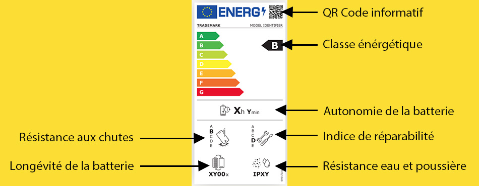 Les autres informations présentes sur les étiquettes énergies des smartphones et tablettes sont spécifiques à ce type de produit. Il s'agit de :
